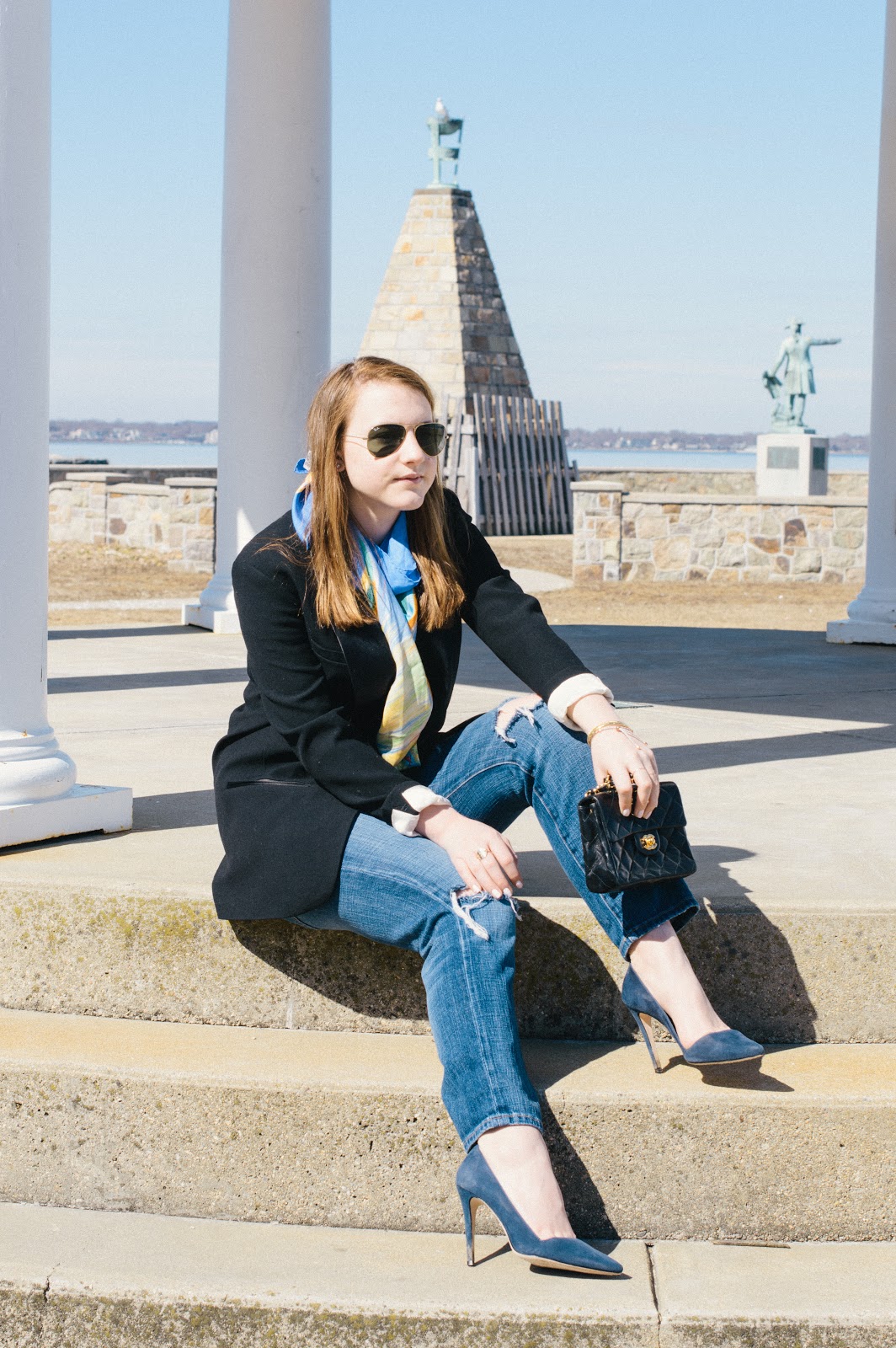 This past weekend, it was great to feel the warm sunshine on my face and for the temperatures to excel 50*. Winter has felt like a massive black hole of polar vortexes and countless feet of snow. Receiving a small taste of Spring boosted my mood (especially being near the ocean this past weekend). Being able to step outside in a blazer and jeans was the best feeling ever. These boyfriend jeans are the closest my legs have been exposed to air the past four months and I cannot wait to wear them more in the Spring. Along with a simple look of jeans and a blazer, a silk scarf spices things up a little. I am not a big scarf person but I love the un-expected twist of wearing it "western style". Here is to a vibrant Spring ahead... don't worry, it is coming.